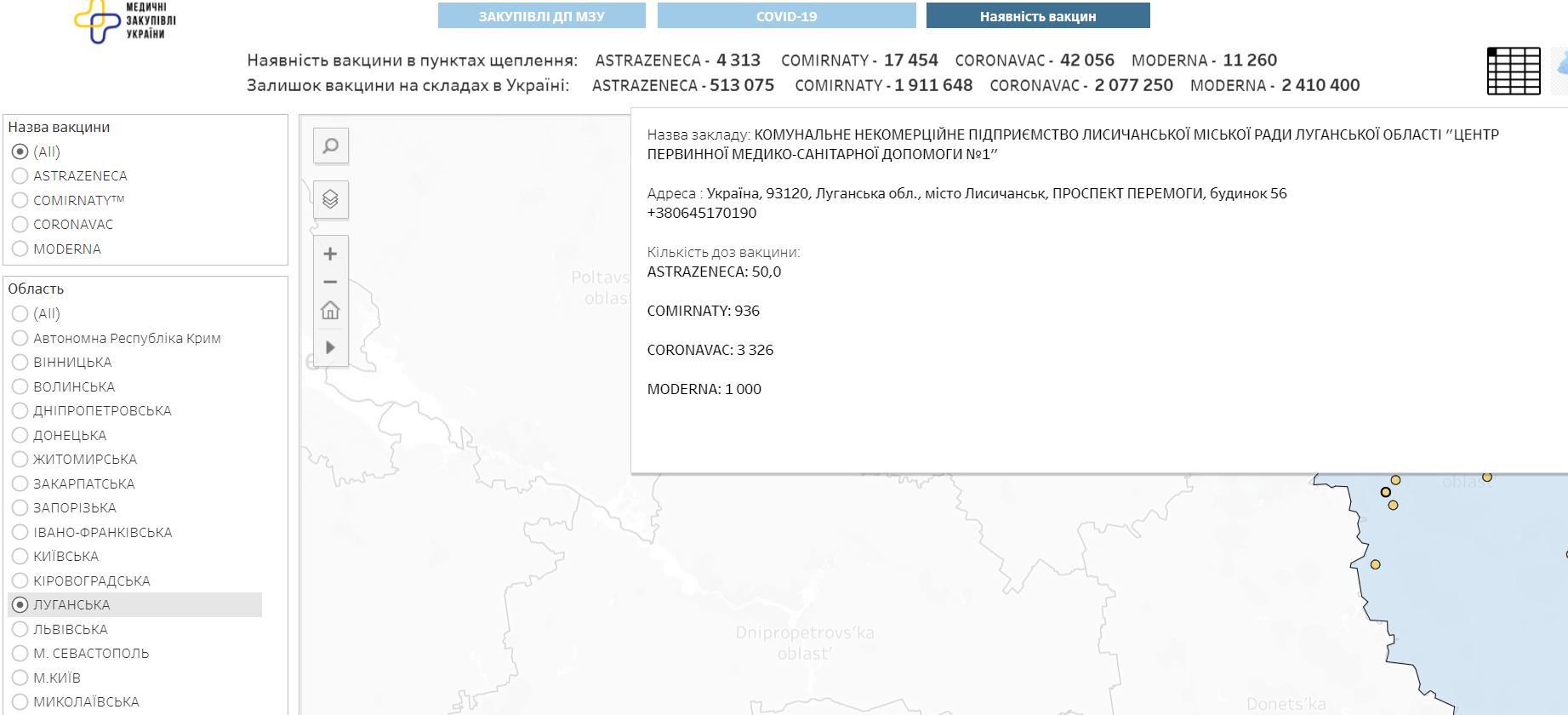 - С компьютера через дешборды ГП МЗУ – можно найти информацию об остатках вакцины против COVID-19 в каждом пункте прививки, действующем в Украине. Данные можно отфильтровывать в разрезе областей или наличия конкретной вакцины.
