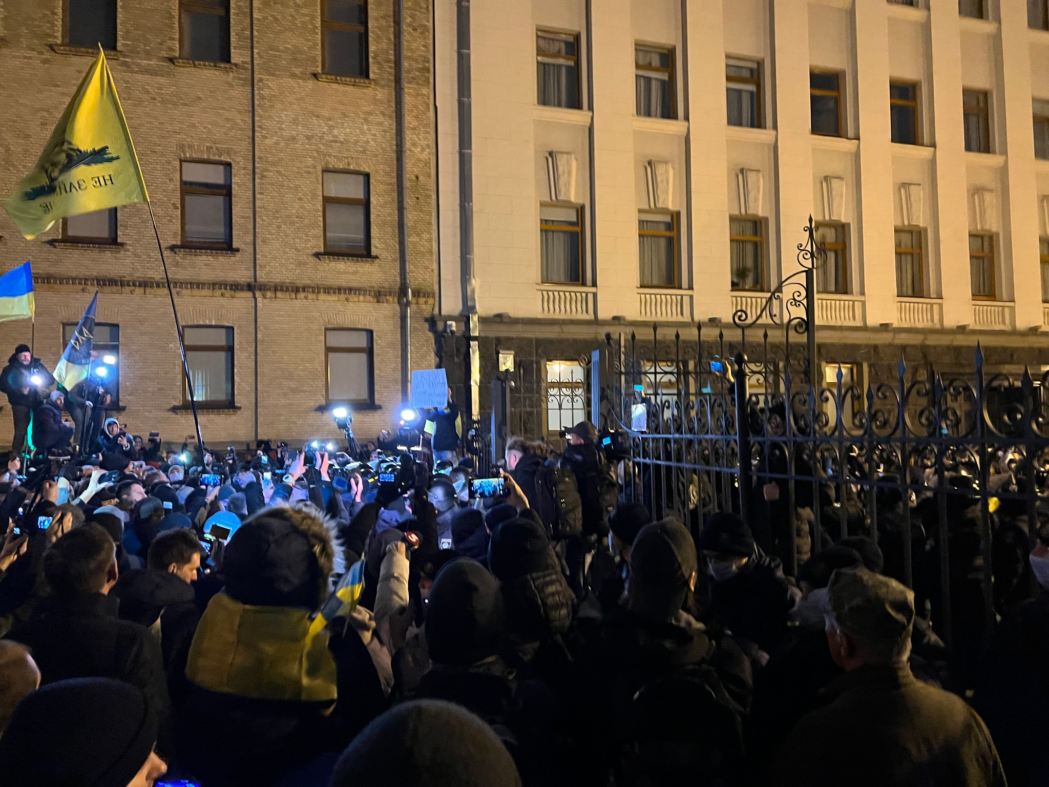 К этому времени Офис президента взяли под усиленную охрану. На улице Банковой участники шествия наткнулись на кордон правоохранителей. Активисты требовали открыть проход и не досматривать вещи участников акции, но правоохранители отказались их пропускать и надели шлемы.