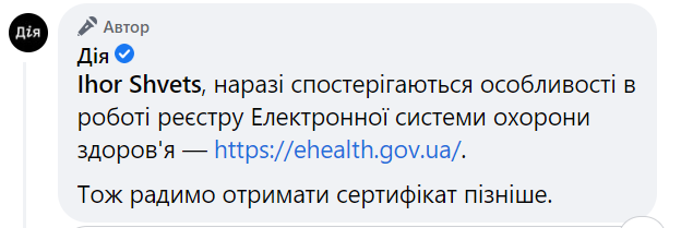 В администрации "Дії" советуют пользователям попробовать сгенерировать сертификат позже.