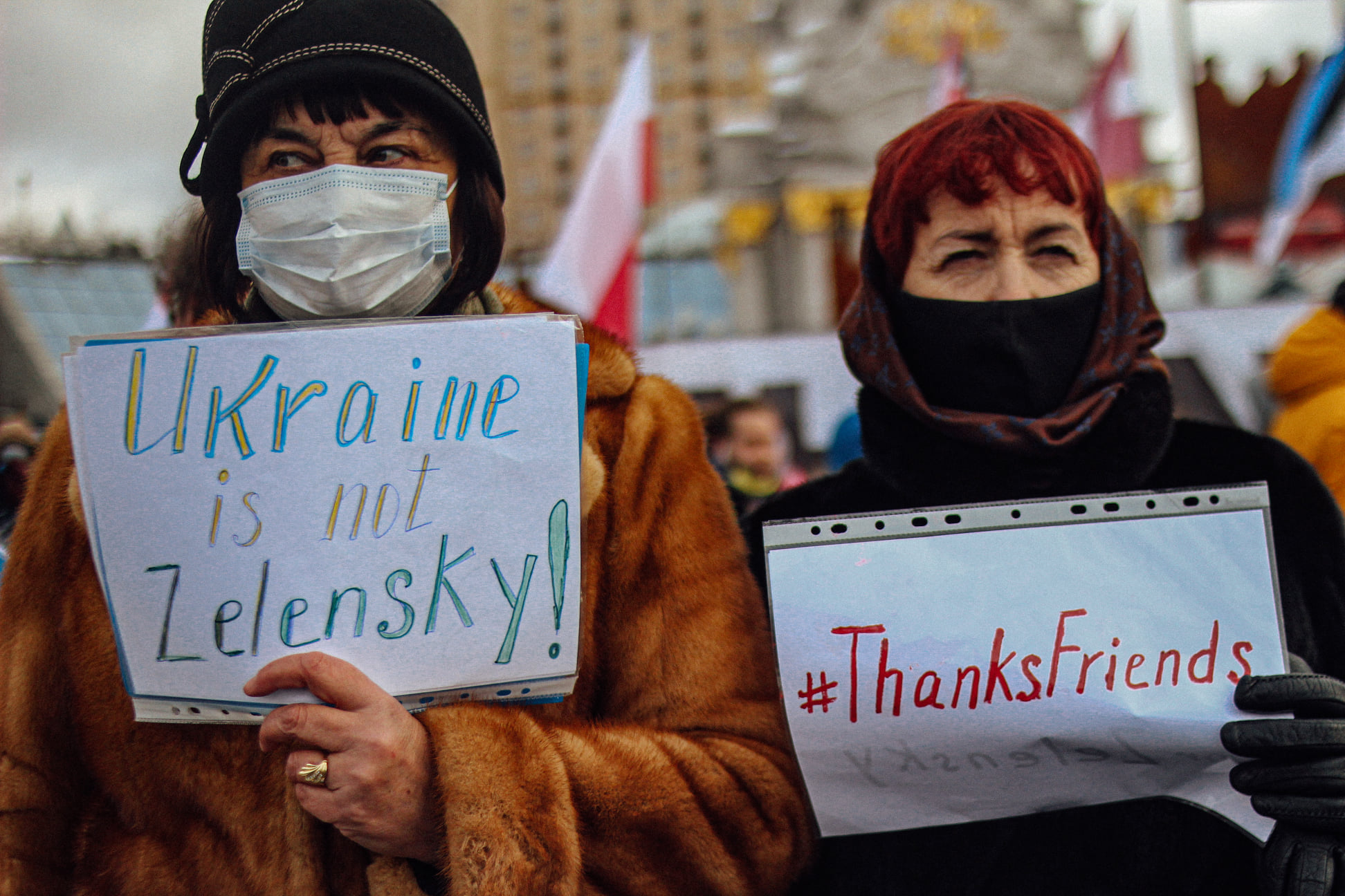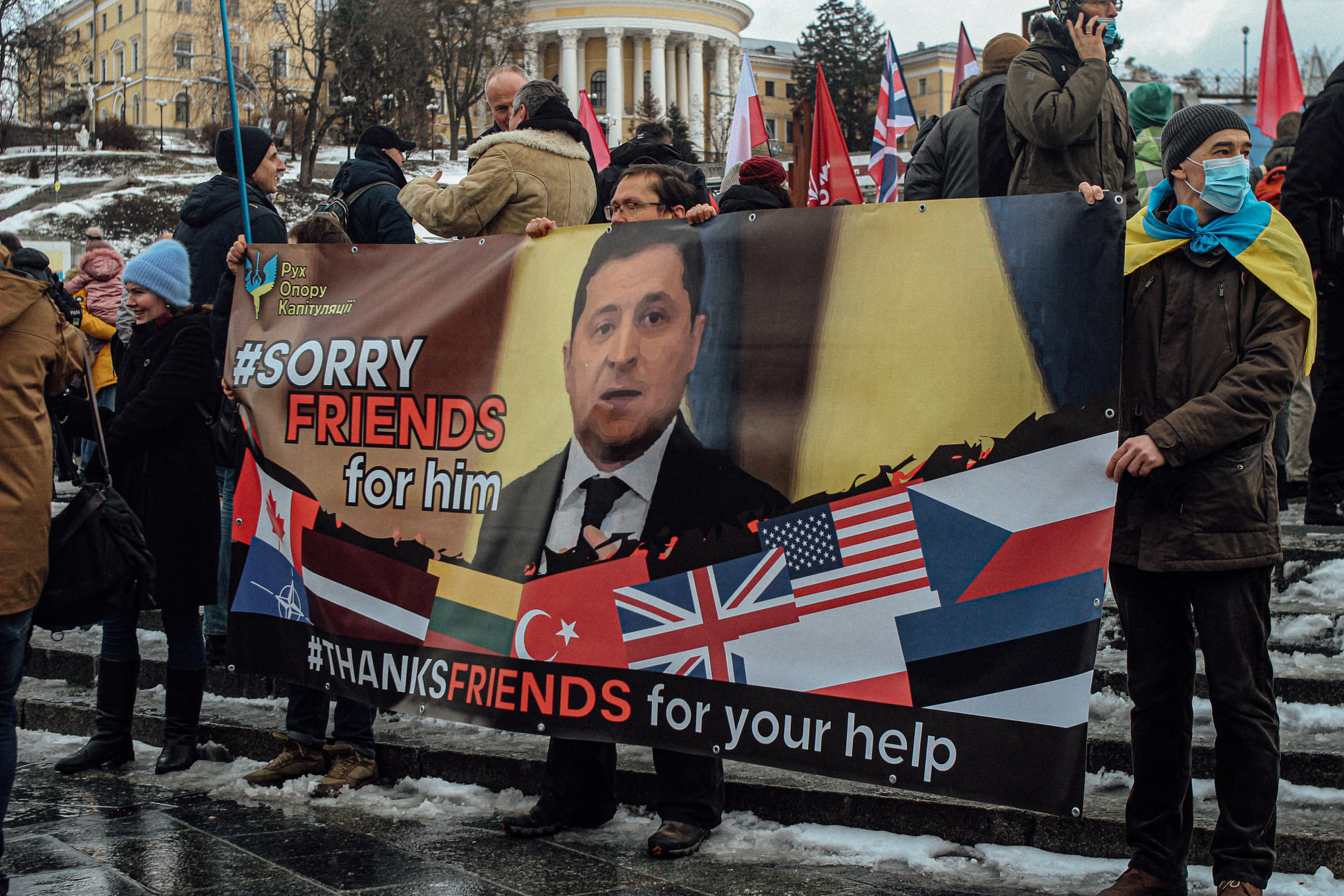 Также на акции были плакаты с извинениями за позицию президента Украины Владимира Зеленского, который не особо верит в реальность российского вторжения, что, по мнению активистов, обесценивает усилия стран-союзников по поддержке Украины.