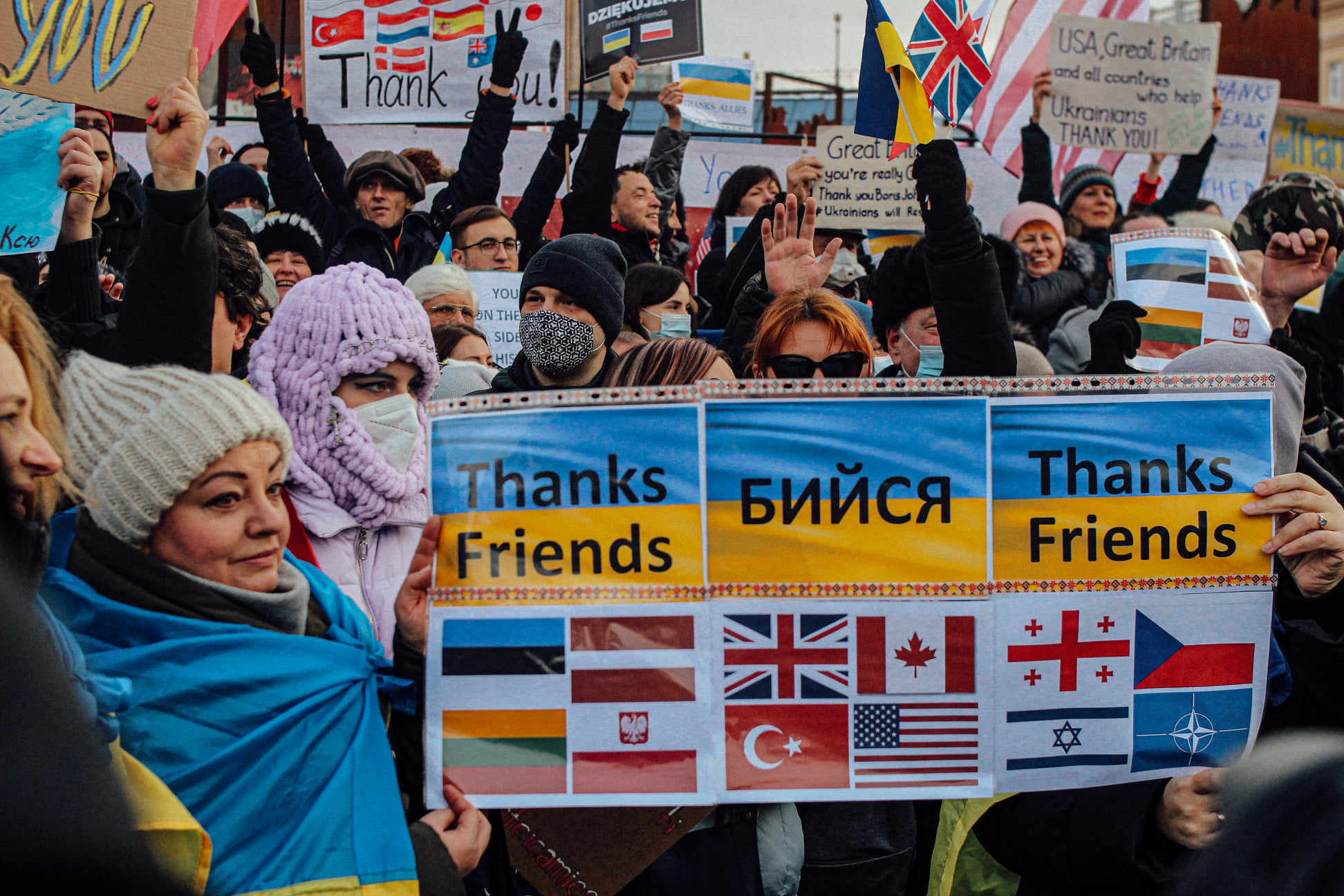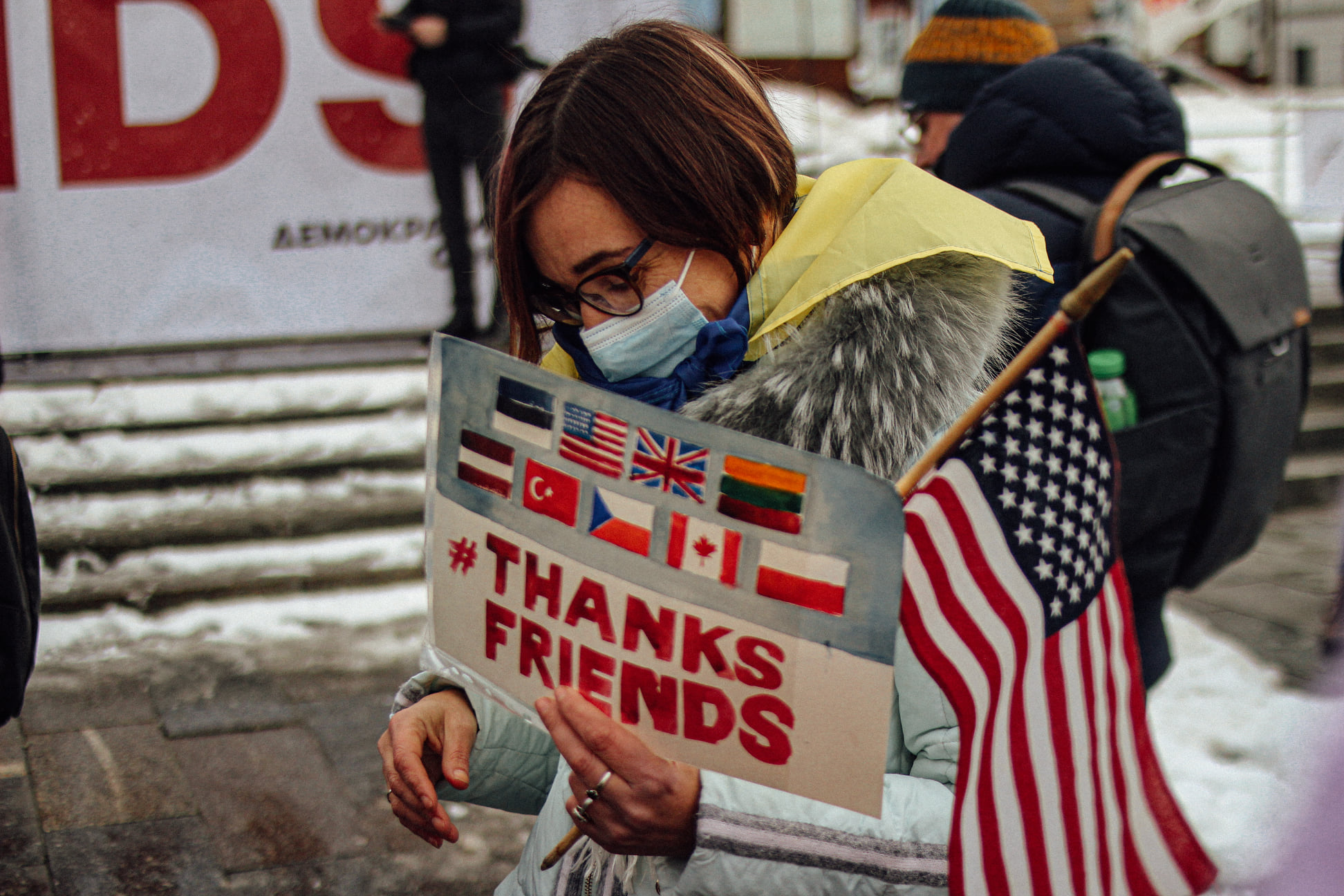 Участники акции пришли с флагами стран, которые оказывают Украине военную и другую помощь на фоне угрозы российской агрессии. Митингующие держали в руках плакаты со словами благодарности друзьям Украины на разных языках.