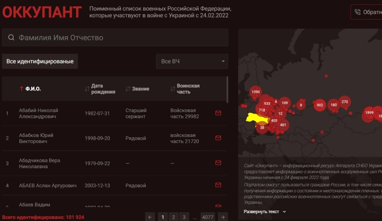 Совет нацбезопасности и обороны Украины запустил сайт "Оккупант", который в оперативном режиме предоставляет информацию о военнопленных вооруженных сил РФ.