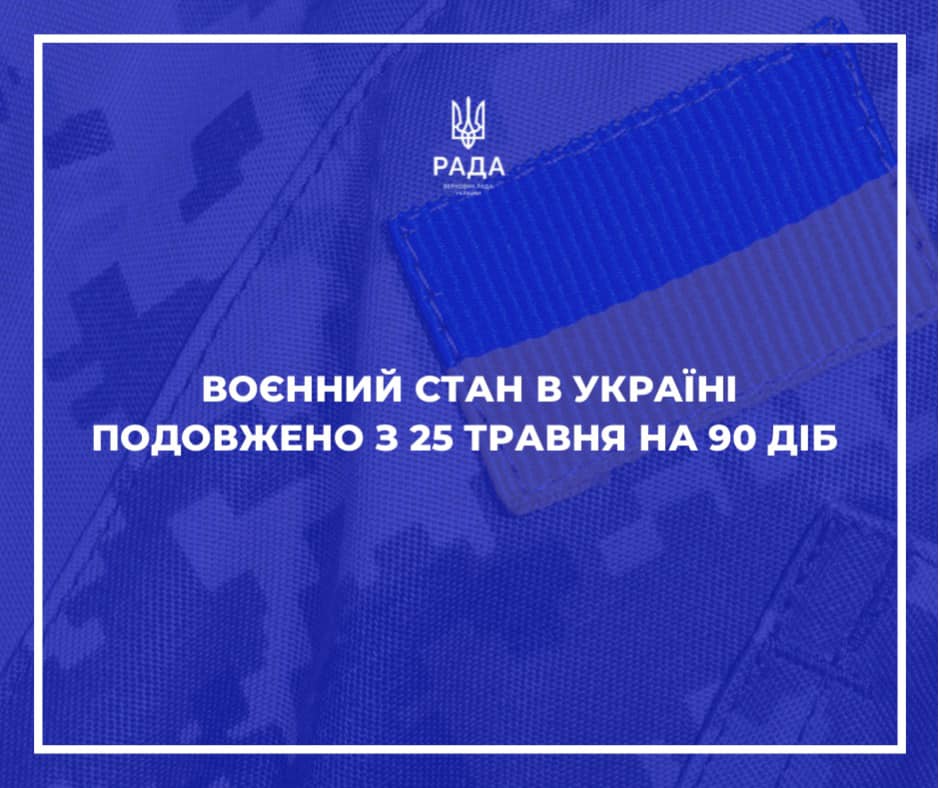 В частности, принятым документом срок действия военного положения в Украине продлевается с 05 часов 30 минут 25 мая 2022 сроком на 90 суток.