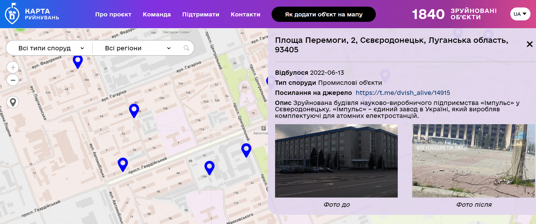 "Цель карты – помочь собрать средства для восстановления всех разрушенных объектов. Правительство создало Фонд восстановления разрушенного имущества, инфраструктуры и государственную фандрейзинговую платформу – UNITED24, где каждый желающий может пожертвовать средства на восстановление", – отмечается на сайте проекта.