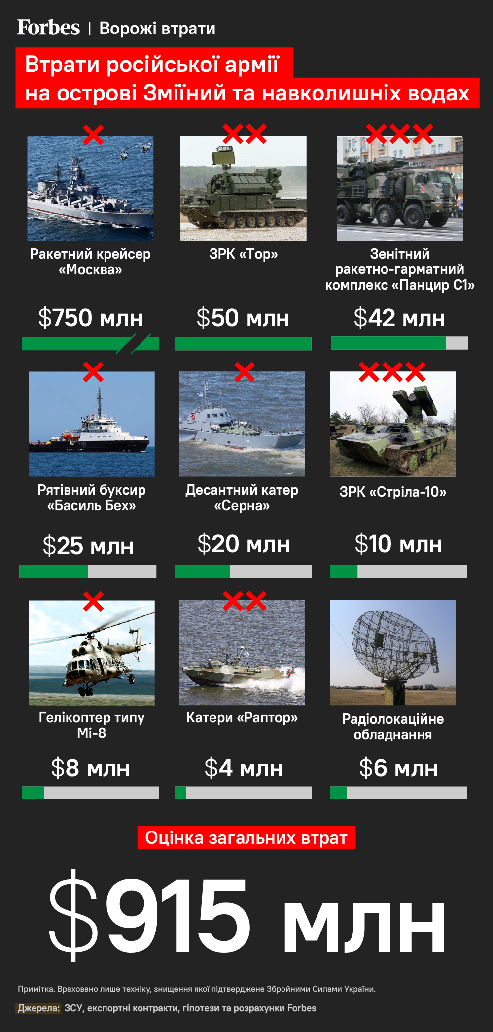 По подсчетам Forbes, общая оценка уничтоженной на Змеином и в окружающих водах техники достигает 915 млн долларов. Отмечается, что при расчетах учтены только известные и подтвержденные потери, перечень которых может быть шире.