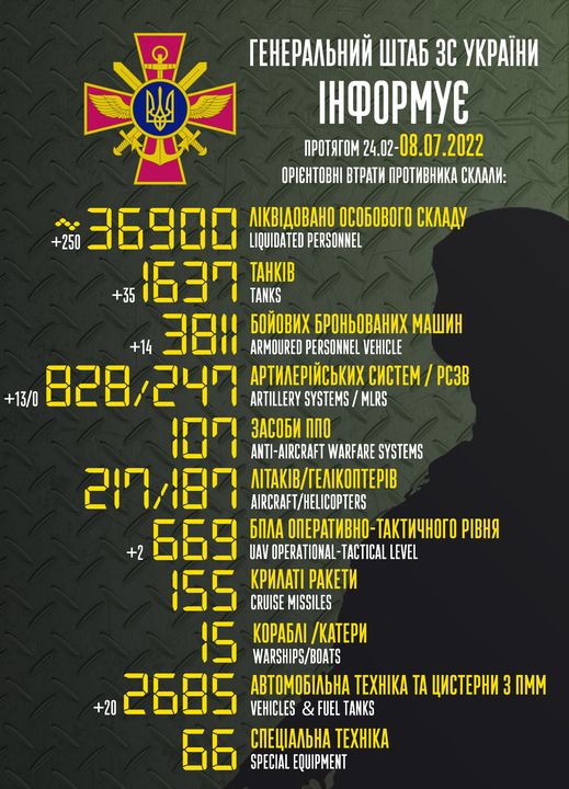 Общие боевые потери противника с 24.02 по 08.07 ориентировочно составили: