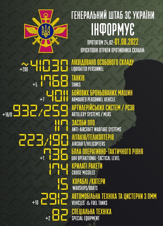 По состоянию на 1 августа общие боевые потери среди личного состава армии РФ составили около 41 030 человек. Наибольшие потери противник понес на Донецком и Криворожском направлениях