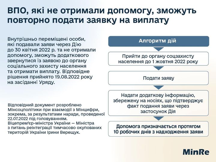 Все внутренние переселенцы, которые пытались оформить государственную помощь до 30 апреля через приложение "Дия", но не получили ее, могут повторно подать заявку на выплату до 1 октября.