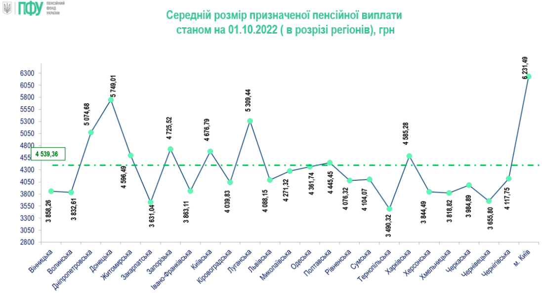 По состоянию на 1 октября 2022 года, самые высокие средние пенсии получают жители Киева, Донецкой и Луганской областей - 6231, 5749 и 6231 гривен соответственно.