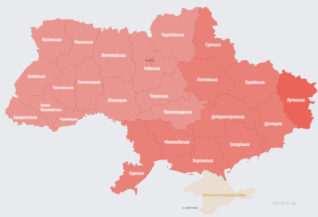 Во всех областях, кроме Крыма, объявлена воздушная тревога, сообщает Час Пик.