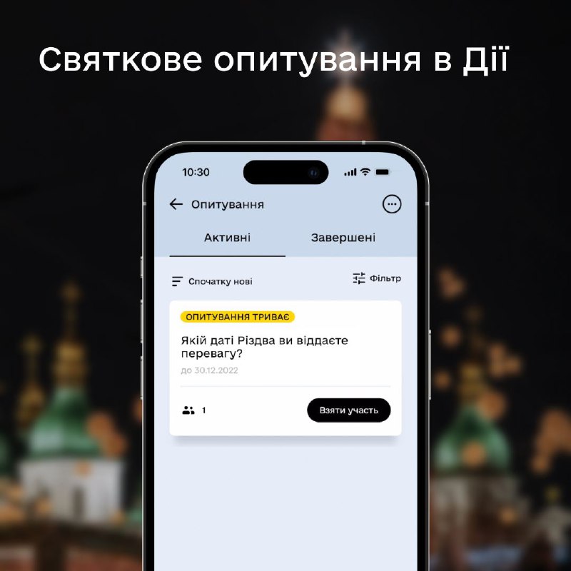 Чтобы пройти опрос, необходимо авторизоваться в "Дии", перейти в "Услуги" внизу экрана, нажать "Опрос" и проголосовать за свой вариант, когда лучше праздновать Рождество в Украине.