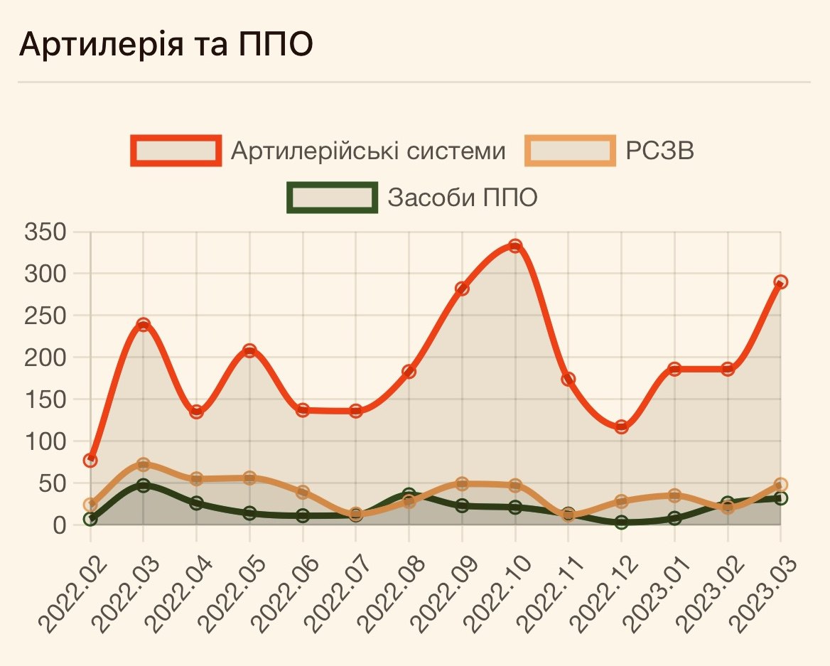 Потери РФ в технике в течение марта 2023 года (в скобках – в среднем все время):