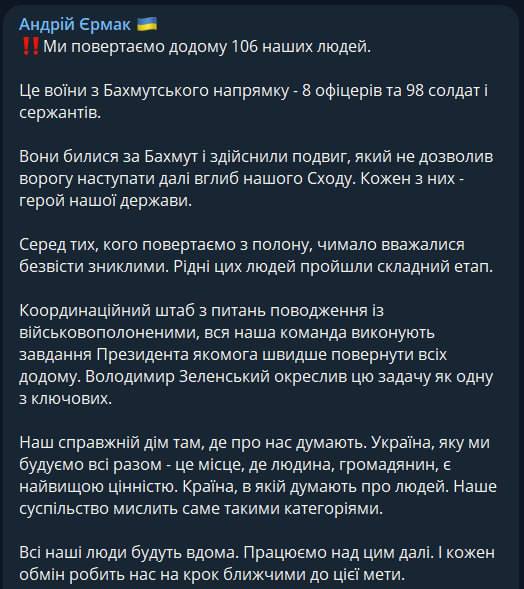 Об этом, в своем ТГ-канале сообщает Ермак, со ссылкой на Координаційний штаб з питань поводження з військовополоненими , передает Час Пик.