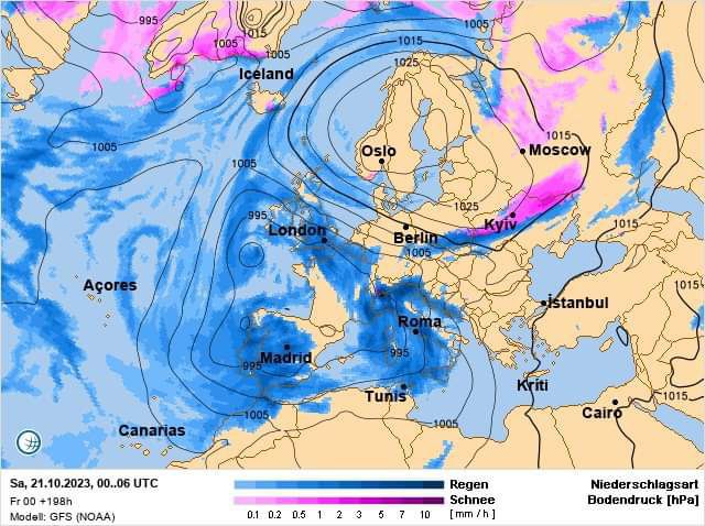 В конце следующей недели на западе и севере Украины местами возможен мокрый снег (на карте осадков розовый цвет - это снег на 21 октября).
