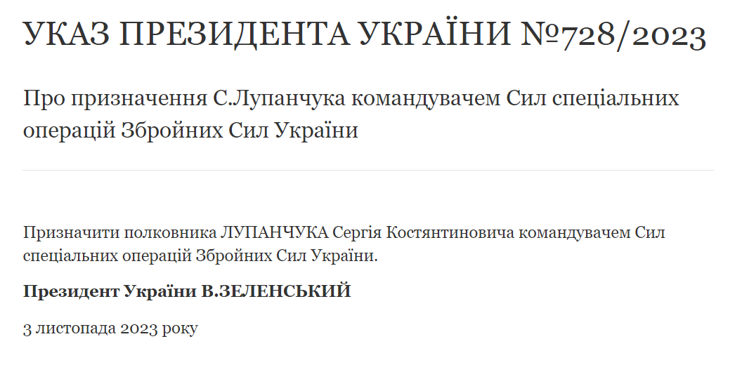 "Назначить полковника Лупанчука Сергея Константиновича командующим Силами специальных операций Вооруженных Сил Украины", – говорится в нем.