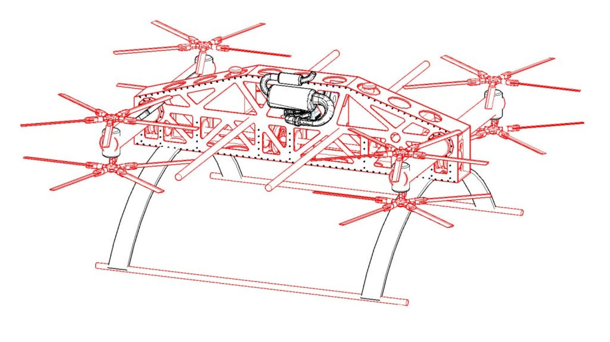 В итоге инженеры получили гигантский квадрокоптер со скелетированной металлической рамой, двигателем Rotax-582 и стойками-полозьями вроде тех, которыми оснащены вертолеты.