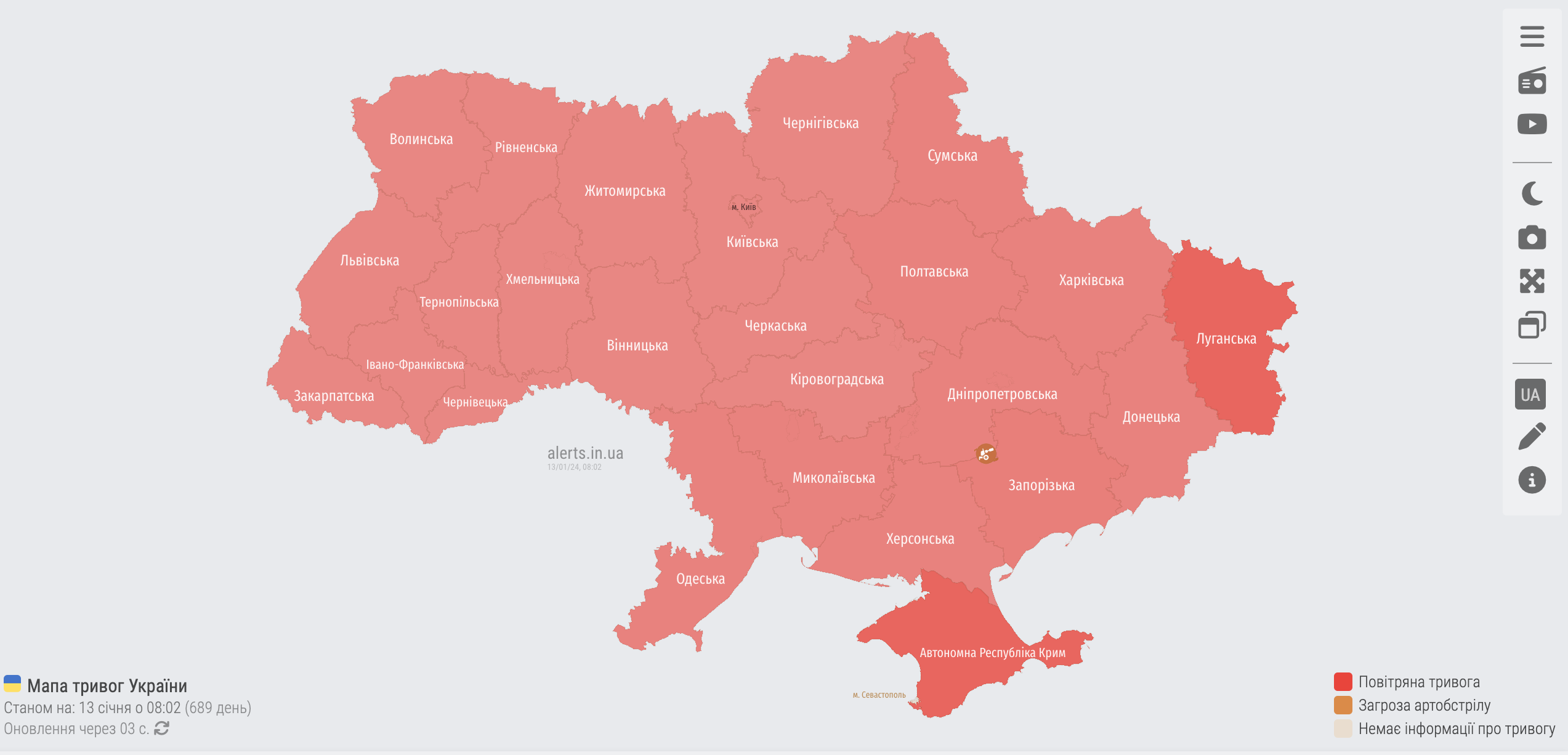 Утром 13 января российская армия в очередной раз атаковала территорию Украины ракетами. В ряде областей прозвучали взрывы.