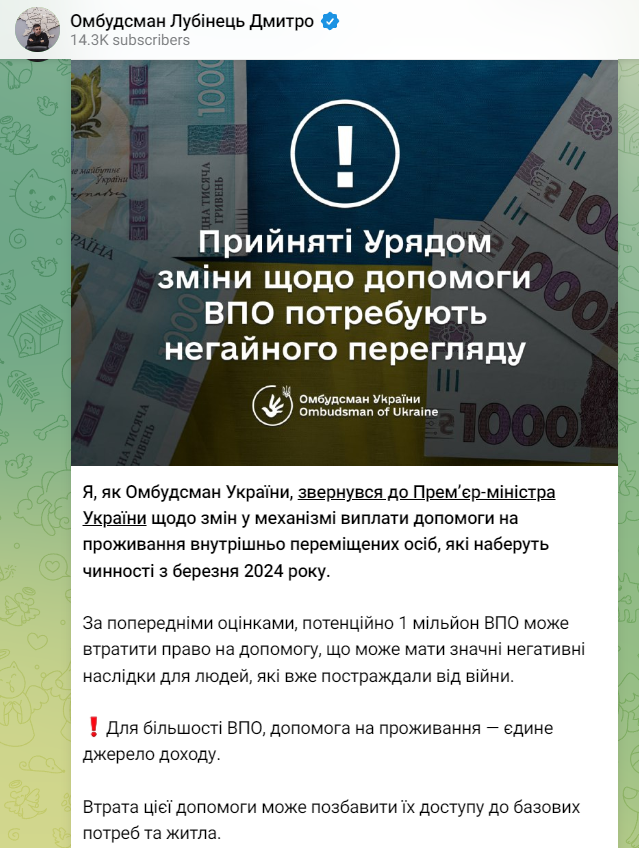 Омбудсмен Украины по правам человека Дмитрий Лубинец обратился к премьер-министру Украины Денису Шмыгалю относительно изменений в механизме выплаты помощи на проживание внутренне перемещенных лиц (ВПЛ), которые вступят в силу с марта 2024 года.