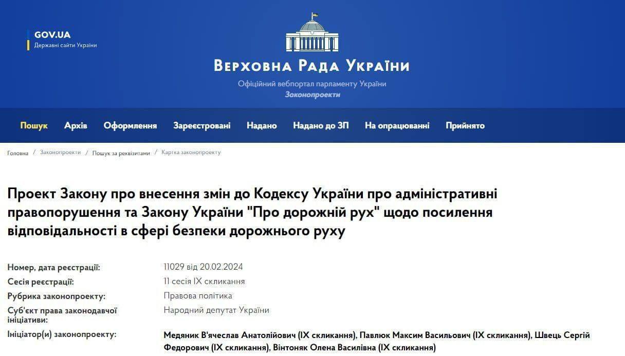 Группа народных депутатов от фракции "Слуга народа" зарегистрировала законопроект 11029 о внесении изменений в Кодекс об административных правонарушениях и Закон «О дорожном движении» об усилении ответственности в сфере безопасности дорожного движения, передает Час Пик.
