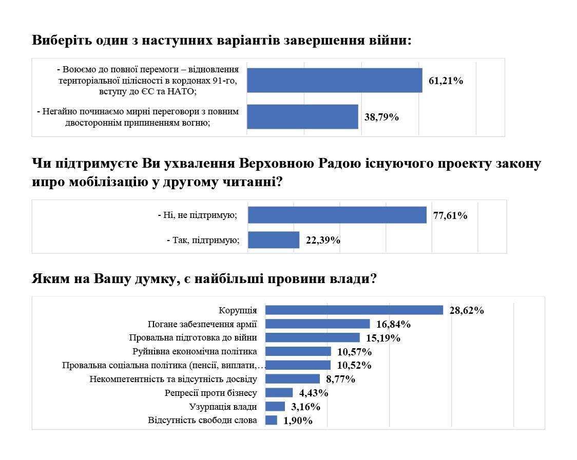 Самой большой проблемой власти украинцы видят уровень коррупции (28,6%), плохое обеспечение армии (16,8%), провальную подготовку к войне (15,2%), разрушительную экономическую политику (10,5%) и провальную социальную политику государства (10,5%). Также большинство украинцев, а именно 77,6%, выступили резко против принятия существующего законопроекта о мобилизации во втором чтении. Большинство украинцев считают, что служить должны подготовленные силовики.