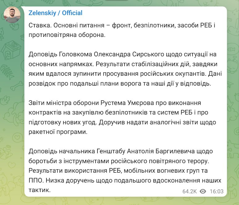 Зеленский уточняет, что заслушал доклад главнокомандующего Александра Сырского о ситуации на основных направлениях. Речь шла о результатах стабилизационных действий, благодаря которым удалось остановить продвижение российских оккупантов.