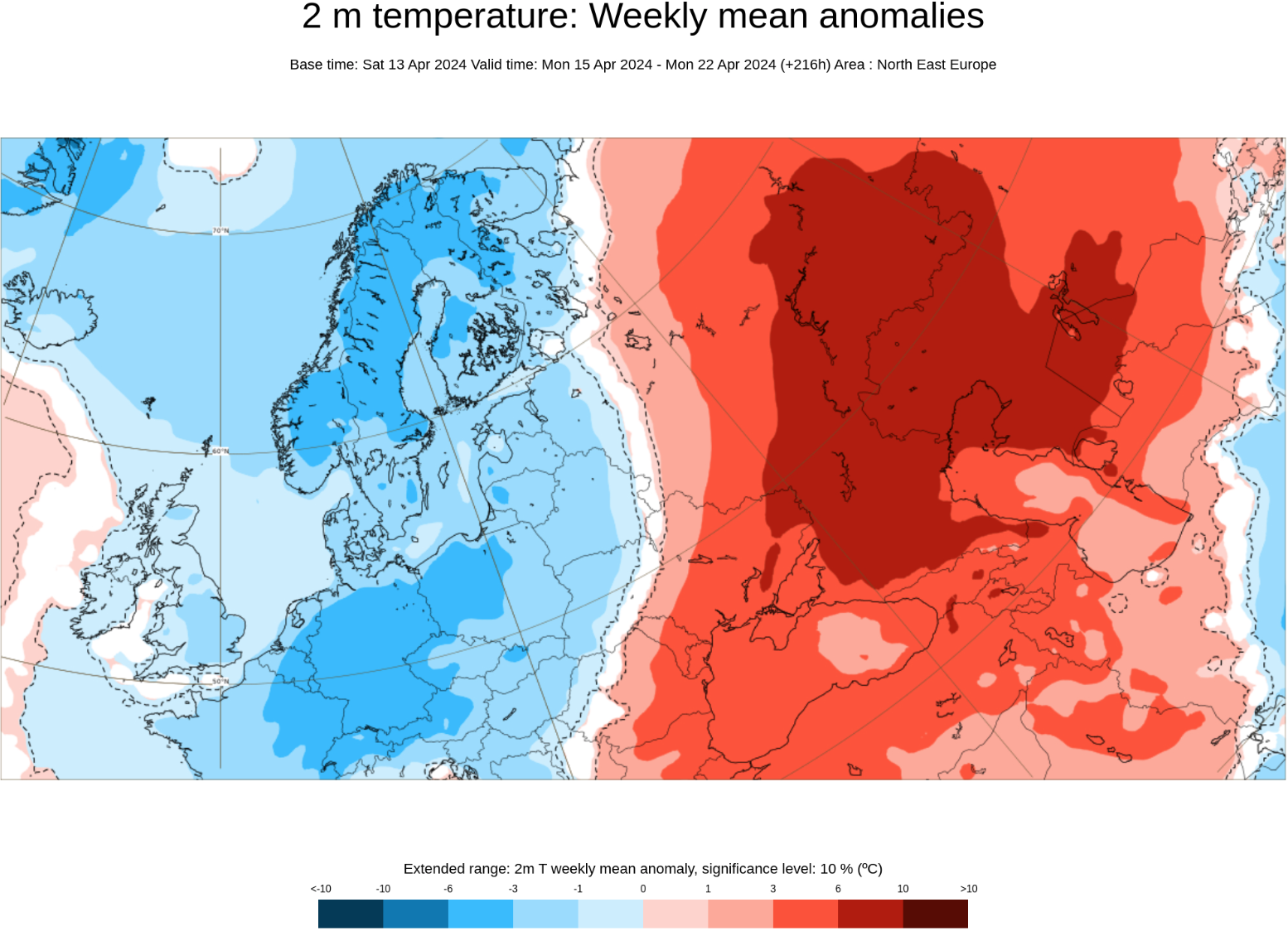 "Поэтому во второй половине недели здесь не исключены заморозки, как на поверхности почвы, так и местами в воздухе. Зрительно такие температурные контрасты хорошо заметны на прогностической карте средней аномалии температуры воздуха в Восточной Европе на период с 15 по 22 апреля", - отмечает Кибальчич.