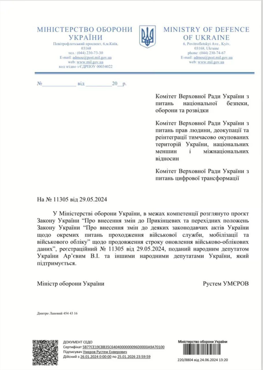 Законопроект №11305 от 29 мая 2024 года получил официальное одобрение Министерства обороны Украины, что подтверждается документом от 24 июня, подписанным министром обороны Рустемом Умеровым и размещенным в системе электронного документооборота (СЭДО).