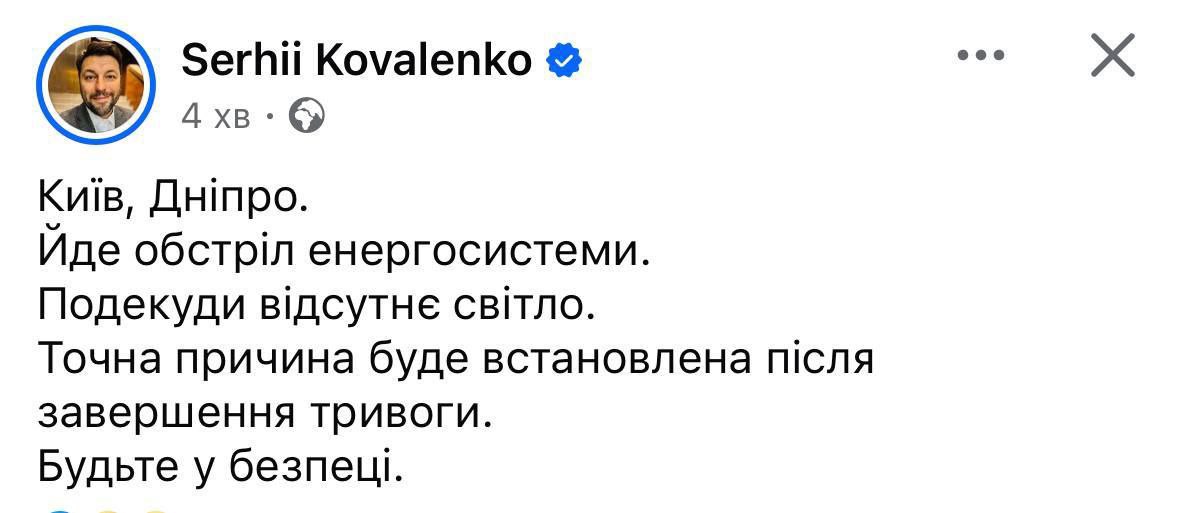По информации от генерального директора компании-поставщика электроэнергии YASNO Сергея Коваленко, в некоторых областях Украины зафиксированы перебои с подачей электроэнергии. Коваленко отметил, что обстрелы энергосистемы продолжаются и точная причина отключений будет установлена после окончания тревоги.