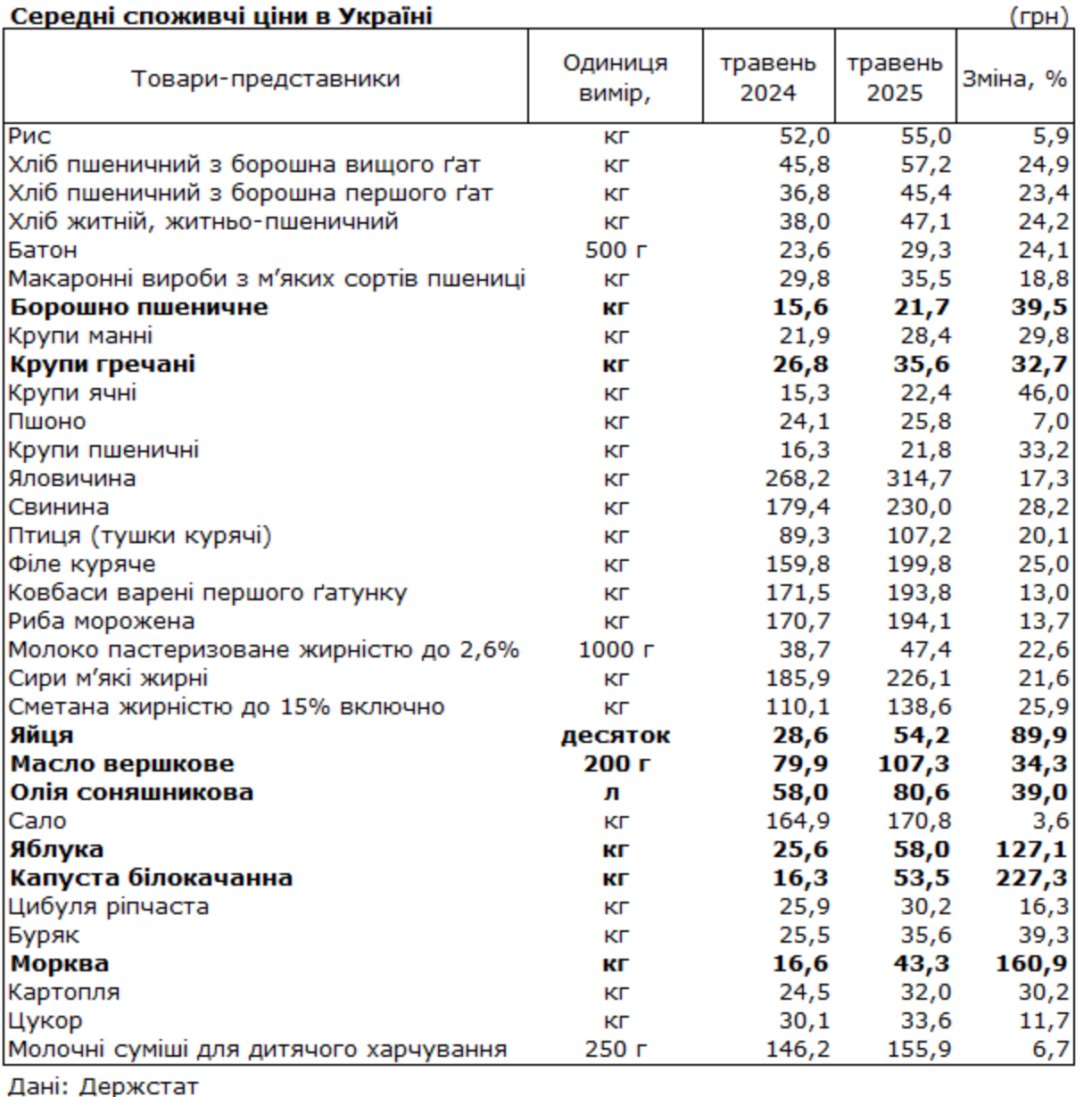 Яблоки подорожали на 127,1% до 58,0 гривен, яйца подорожали на 89,9% до 54,2 гривен за десяток, мука на 39,5% до 21,7 гривен за килограмм, крупа гречневая на 32,7% до 35,6 гривен за килограмм.