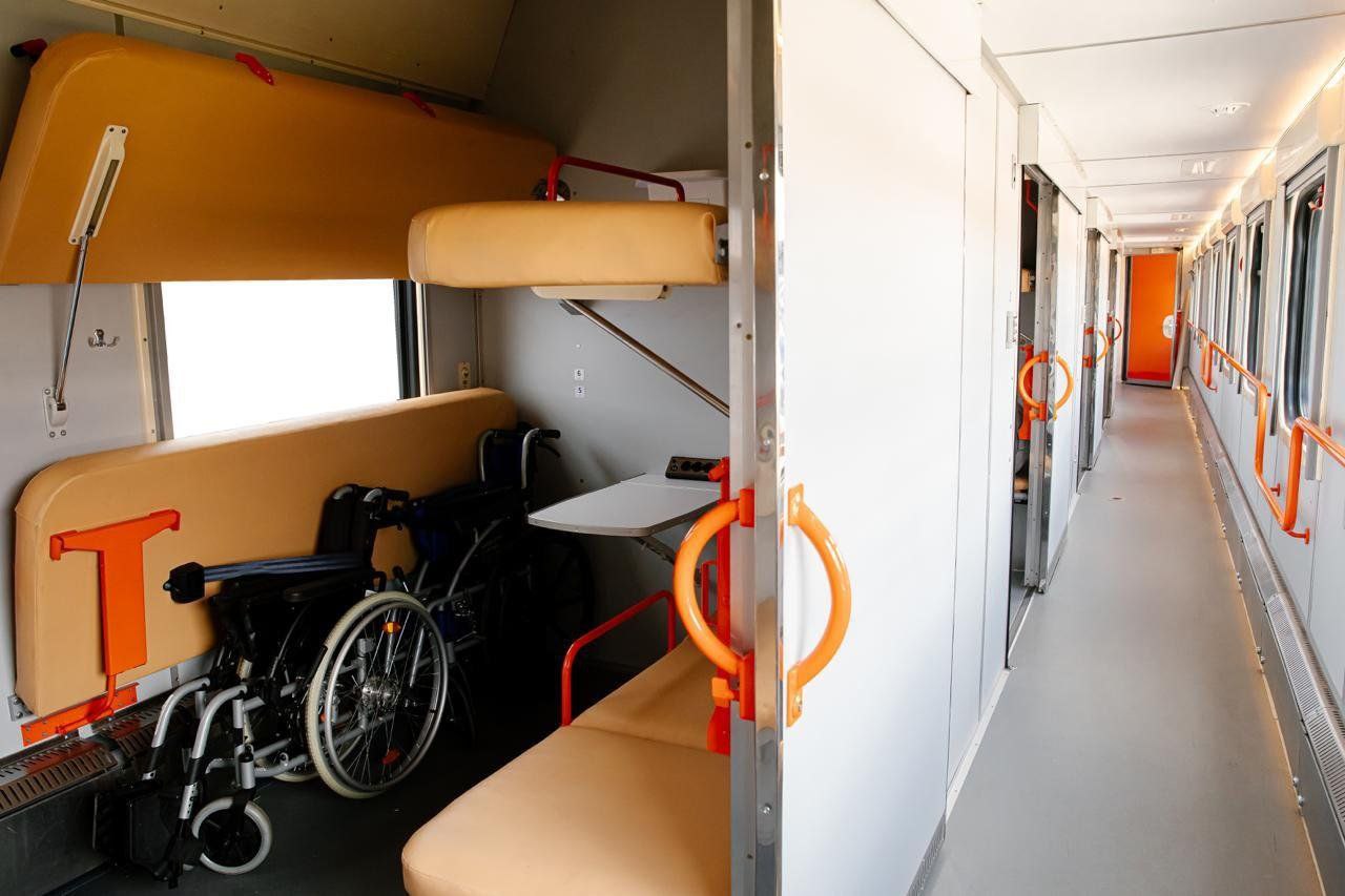 - 4 увеличенных купе: каждое вмещает двух пассажиров на колясках и двух сопровождающих.