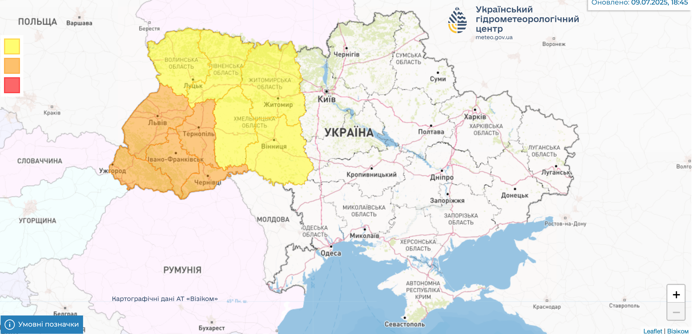 "9 июля в западных, Житомирской и Винницкой областях грозы, местами град и шквалы 15-20 м/с, в большинстве западных, Винницкой и Житомирской областях значительные дожди (I уровень опасности, желтый). 10 июля в Волынской, Ровенской, Хмельницкой, Житомирской и Винницкой областях значительные дожди, грозы (I уровень опасности, желтый); в Закарпатской, Львовской, Ивано-Франковской, Черновицкой и Тернопольской областях сильные дожди (II уровень опасности, оранжевый)", - говорится в сообщении.