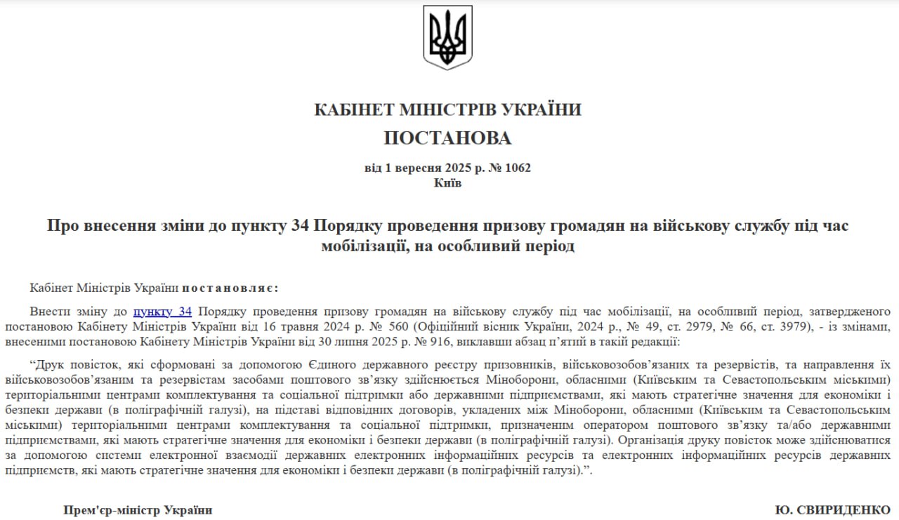 Кабмин автоматизировал выдачу повесток: теперь их печать централизована, данные синхронизируются между государственными реестрами, а вручать повестки можно заказными письмами через «Укрпочту», что устраняет юридические споры о получении.