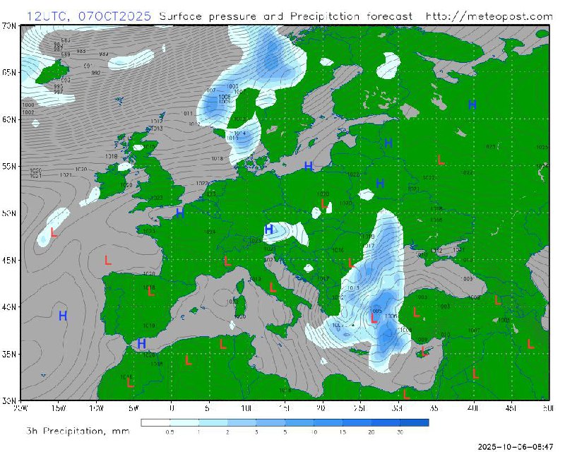 7 октября погоду в Украине будет формировать южный циклон, который вместе с атмосферными фронтами принесет дожди на часть территории страны.
