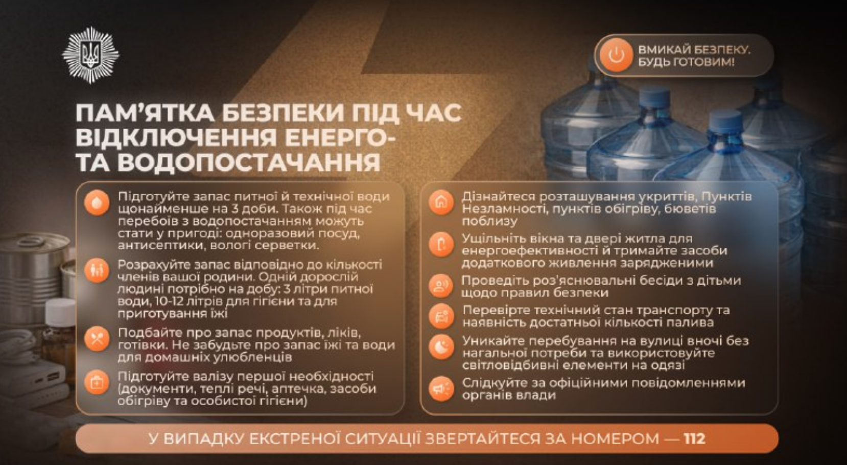 Украинцам также следует готовиться к усилению мер безопасности. В частности, надо следить за заявлениями властей, а также зарядом устройств и альтернативные источники электроэнергии, ограничить пребывание на улице без надобности, особенно ночью.