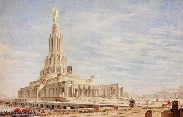 Проект строительства Дворца Советов на месте храма Христа Спасителя появился в начале 1930-х годов; для осуществления этого замысла храм был взорван в 1931 году. Предполагалось, что здание будет иметь в высоту 420 метров и станет самым высоким в мире. Из-за Великой Отечественной войны строительство было заморожено, а в конце 1950-х годов, уже после смерти Сталина, окончательно отменено. Впоследствии на этом месте долгие годы находился открытый зимний плавательный бассейн «Москва».