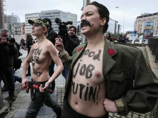 Две активистки с обнаженной грудью и надписями на теле "Путин – убийца демократии" и "Хорошая работа, Путин!" пикетировали штаб-квартиру ЕС в Брюсселе. Одна из участниц акции протеста приклеила накладные усы, изображала Иосифа Сталина и курила трубку.