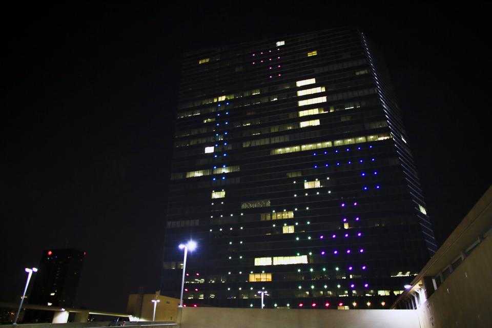 29-этажный Сира-центр, который имеет сотни светодиодных фонарей, встроенных в его стеклянный фасад, обычно отображает красочные геометрические узоры в ночное время. В субботу, образы небоскреб превратился в экран, а игроки управляли джойстиком фигурами.
