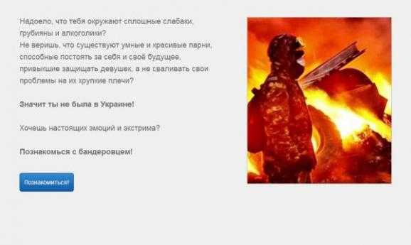 Впрочем, при нажатии на кнопку "Познакомиться", любительниц интернет-любви, ждет разочарование, ведь "все бандеровцы сейчас гоняют зеленых человечков".