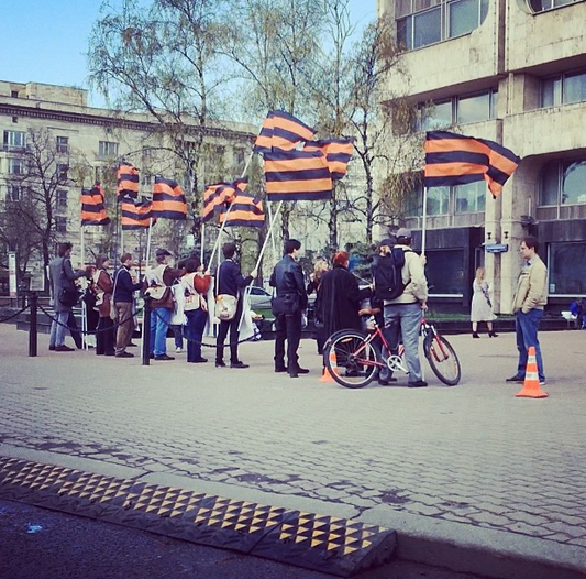 В Москве к зданию ИТАР-ТАСС пришли люди с оранжево-черными флагами и скандируют "Долой пятую колонну!", сообщают пользователи Twitter.