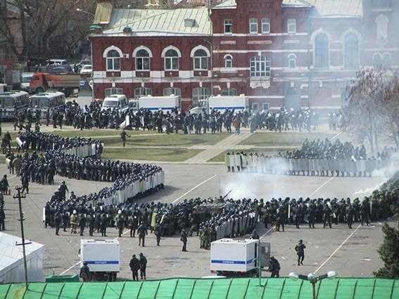 Днем 16 апреля на Театральной площади Саратова прошли учения по разгону оппозиционного митинга. Группа из 120-140 полицейских в белых касках изображала митингующих с плакатами и флагами. Затем толпа сконцентрировалась и направилась к улице Московской. В этот момент на площадь бегом выдвинулись колонны ОМОНа с бронещитами. Условные оппозиционеры зажгли фаеры желтого и синего цветов. На какое-то время над толпой повисло облако, расцвеченное под украинский флаг. Над площадью барражировал вертолет. ОМОН начал блокировать протестующих, вступив с ними в столкновение. Полетели дымовые гранаты. Часть мятежников сумела прорваться через оцепление и была задержана уже у здания правительства на проезжей части улицы Московской. Подошли автозаки. В центр площади выехал БТР, который, видимо, для устрашения открыл стрельбу в воздух из башенного пулемета. Еще около часа после «разгона» над центром города барражировал вертолет. В мероприятиях участвовали спецподразделения полиции и дислоцированный в Саратове контрактный полк внутренних войск. Как выяснилось, вместе с высшим командным составом за происходящим наблюдал губернатор Валерий Радаев, по некоторым сообщениям, именно он попросил МВД включить данный сценарий в программу учений. При этом полиция старалась сохранить в тайне тактические приемы, применяемые в их ходе – прессу решительно удаляли с возможных точек съемки, а сама площадь была закрыта от обзора плотными рядами автобусов и другой техники, выставленной по периметру