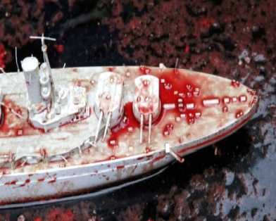Кроме того, протестующие поставили напротив посольства Франции бассейн с красной жидкостью, символизирующей кровь. В нем запустили игрушечные кораблики.