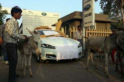 Сломанный Jaguar не только транспортировался в сервис необычным способом, который удивил случайных свидетелей этого инцидента, но и был украшен плакатами, написанными негодующим автолюбителем от руки на его родном языке гуджарати и гласившими: «Псевдомашина, псевдокомпания, псевдосервис». Еще одна надпись заявляла о преимуществах владения шестиместной авторикшей вместо Jaguar. На самом большом плакате, разместившемся на лобовом стекле, был вопрос: «Что лучше — осел или Jaguar за пять миллионов рупий?».