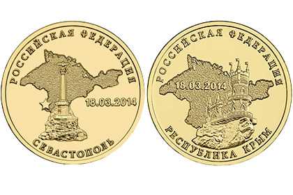 «Банк России 9 октября 2014 года выпускает в обращение в рамках эмиссионной программы монеты из недрагоценного металла номиналом 10 рублей, посвященные вхождению в состав Российской Федерации Республики Крым и города федерального значения Севастополя: Республика Крым, Севастополь», — говорится в сообщении ЦБ.