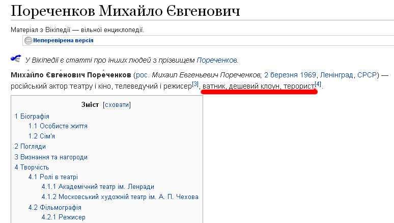 Со вчерашнего дня в "Википедии" идет так называемая война правок, где Пореченкова называют террористом, известным бойцом ДНР, убийцей украинских военных. Обострение гнева и возмущения во всемирной сети связано с тем, что вчера российский актер открыто поддержал террористов в штурме аэропорта.