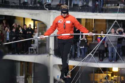 Десятки тысяч человек собрались на улицах города, чтобы понаблюдать за тем, как 35-летний канатоходец ставит очередной рекорд. Один из тросов был натянут над рекой Чикаго, причем под углом в 19 градусов. Второй расположился между двумя башнями небоскреба Marina City. Этот маршрут Валленда преодолел с завязанными глазами. После того, как он сдернул повязку, зрители наградили его громкими овациями.