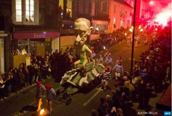 В рамках празднования Ночи Гая Фокса (когда британцы празднуют провал Порохового заговора, участники которой хотели взорвать британский парламент вместе с королем) в британском городке Льюис по улицам возили предназначенное для сожжения чучело российского президента Владимира Путина верхом на танке.