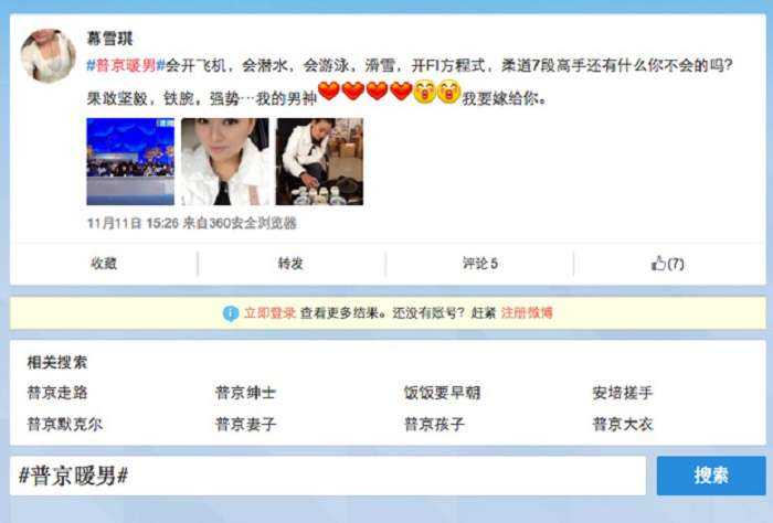 Однако обсуждения «случая с шалью» перенеслось в китайскую соцсеть Weibo (китайский аналог соцсети Twitter), где практически сразу были запущены хэштеги «Заботливый Путин» (#普京暖男) и «Путин джентльмен» (#普京绅士).
