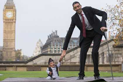 Самый высокий человек в мире, турок Султан Кесен (Sultan Kosen), пообщался с самым маленьким жителем планеты, непальцем Чандрой Данги (Chandra Dangi), пишет The Telegraph. Рост Кесена составляет 251 сантиметр, Данги — 54,6 сантиметра.