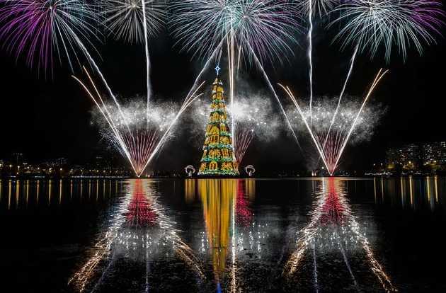 Рождественский сезон в Бразилии открылся сиянием огней на самой высокой в мире плавучей елке. 85-метровая красавица возвышается над лагуной в Рио-де-Жанейро.