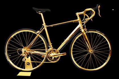 Компания Goldgenie из Великобритании создала велосипед, который полностью покрыт 24-каратным золотом. Об этом сообщается на сайте фирмы. Транспортное средство было изготовлено на базе мужской гоночной модели. Цена самого дорогого золотого велосипеда составила 250 тысяч фунтов (около 400 тысяч долларов).